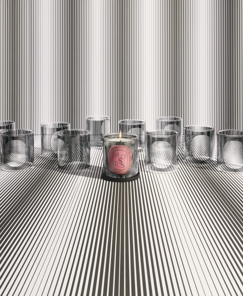 Turn the glass holder around and you’ll see a constantly changing look. Coming into sharp relief on the Baies candle, moving from the circle to the diamond shape on Figuier, decked out in moiré effects on Roses and chequered on Tubéreuse, the signature diptyque oval branding design disappears – only to reappear, stronger than ever.